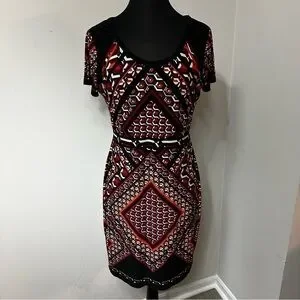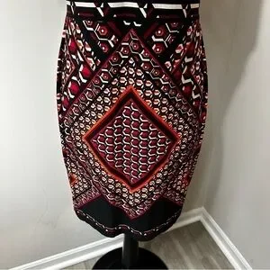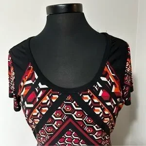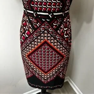Calvin Klein Color Block Dress in Size 12. Short sleeve, scoop neck, sheath, color blocked detail, aztec or tribal print, boho, knee length. Material – 95% Polyester, 5% Spandex. Approximate Measurements: Length - 35.5”, Bust - 18.5”.