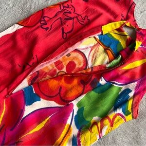 Excellent vintage condition. Furphy Maxi Dress by Jams World in white with vibrant red, yellow, orange, purple, blue and green detailing. Tropical resort aesthetic, perfect for the beach, a cruise or vacation this season. True vintage, circa 90s. Sleeveless long maxi dress with modest round neckline and back keyhole button and zipper closure. Side slit. Allover blocked artsy Hawaiian floral nature print, including butterflies, frogs and ladybugs, see video. Made in Hawaii. 100% crinkle rayon. Size medium, see photos for measurements.