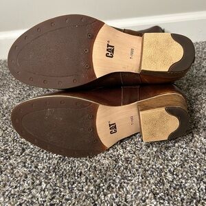 CAT by Caterpillar beautiful well built leather boots with almost 2” heels. Body of the boot is 11” high. Strong zipper up the back. Bottom of the soles are clean and look like they haven’t been worn.