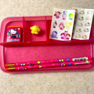 Hello Kitty Sanrio vintage pencil box Y2K kitty jeans pink too rare stickers pencils eraser