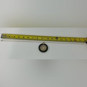 This green Jadeite pendant has an intricate Asian-inspired gold-tone center and delicate chain with spring ring clasp. See photos for appropriate measurements. Shows some wear (hairline scratches) and discoloration on underside.