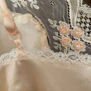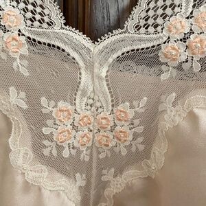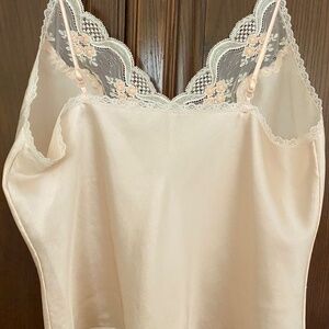 Pale pink camisole top with lacy neckline and trim. Polyester. No tags. M size. Preowned. fine condition.