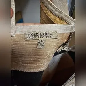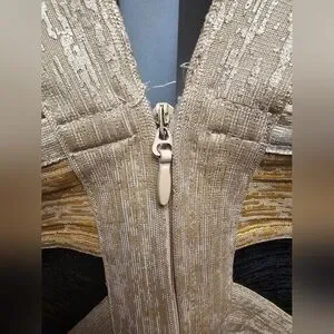 Sleeveless, plunge, bodycon silhouette, metallic detail, chain accents, cut outs, gold, knee length