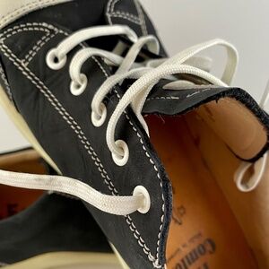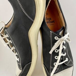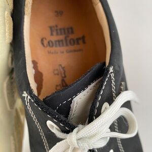 Finn comfort sneakers from Germany. Well-made shoes for sports, walking, leisure. Black shoe with white leather trim and sole and laces. EU size 39 , which translates to US women's size 8, men's 6.5. Thes shoes have been work; they are in good condition, despite the photos of the soles. They have been washed. They are in fine condition.