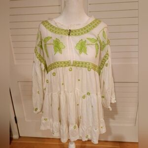 New with Tags Free People Edie Embroidered Top White and Green Combo Size Large oversized fit. In new giftable condition, no wear or callouts. Raw finish neckline, vibrant green embroidery with beaded accents. Perfect spring and summer lightweight flowly white tunic featuring vibrant green embroidery. Perfect for a casual day out. Measures 22 inches pit to pit, 25 inches shoulder to bottom seam, and 17 inches long sleeves. Ships from smoke-free and pet free home.