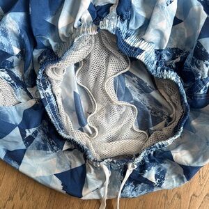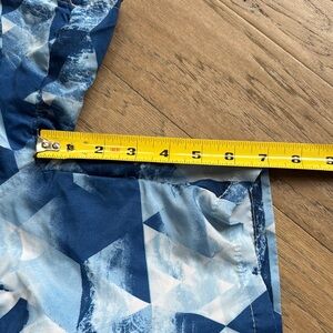 These swim trunks feature a striking blue geometric design, perfect for dynamic summer activities. Made from lightweight material, they offer comfort and style with an elastic waistband and a modern mosaic-like pattern.