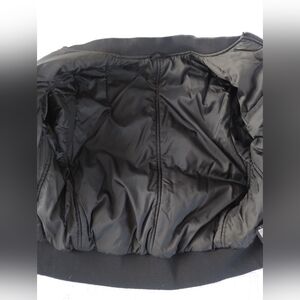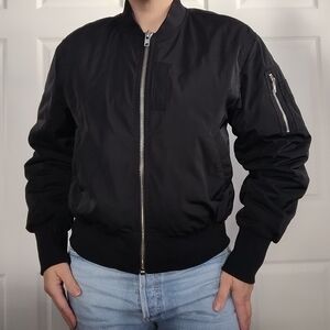 Stylish black bomber jacket. Features a zip closure. Perfect for casual wear.