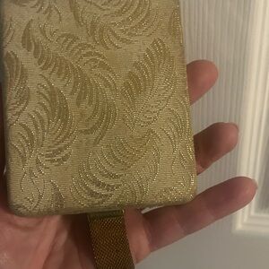 A beauty vintsge compact carryall by Zell from the 1960’s. It features a brocade case with a copper wristlet. Inside is a gold change purse, a brass lipstick tube, a brass compact, and a small comb. Nothing is broken but the compact and case shows signs of wear. I have priced this accordingly.
