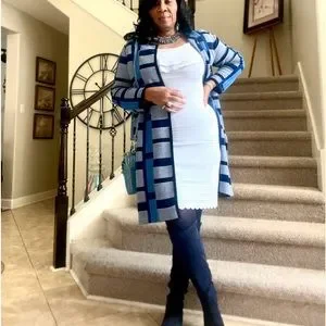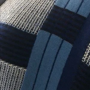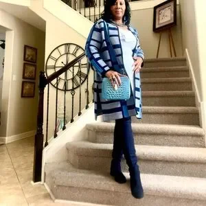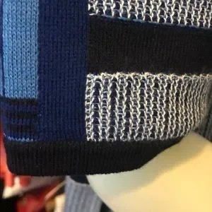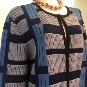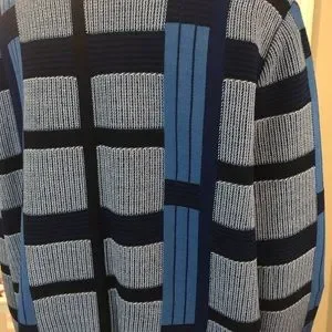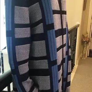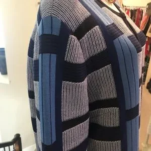It’s a fabulous multi blue sweater jacket. Long sleeves, a nice heavy knit. Swing open, a nice layering piece. Excellent!