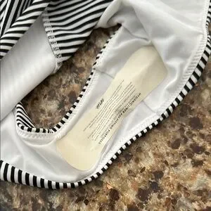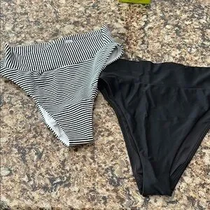 Stylish bikini bottoms featuring one striped and one solid black design. Perfect for mix and match.