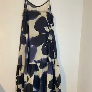 This sleeveless dress features a stunning floral pattern in shades of blue and cream. Perfect for any occasion, it offers a stylish and comfortable fit. 100% Cotton Side Zipper Pockets