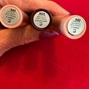 Clinique Pop Plush creamy lip gloss, set of three, each contains .07 fluid oz. There are two Airkiss Pop tubes and one Black Honey Pop tube. Brand new!