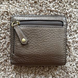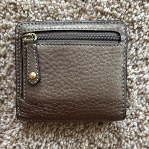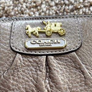 This elegant Coach wallet features a metallic bronze leather design. Perfect for organizing your essentials with style. Some slight wear to hardware. Small stain on interior. See photos.