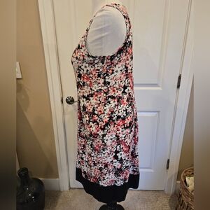 Sleeveless floral dress. Vibrant floral pattern. Slip-on design. Significant 4-way stretch. No pockets. Rayon lycra blend.