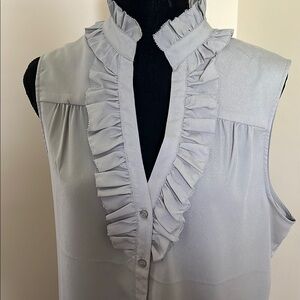 Elevate your wardrobe with this elegant gray sleeveless top. Featuring a stylish ruffled neckline, it's perfect for any occasion.