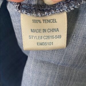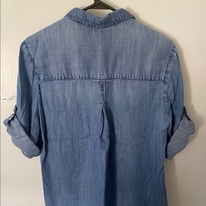 Casual chambray 1/2button-up shirt with rolled sleeves. Perfect for everyday wear. It’s super comfy and versatile. 100% tencel.