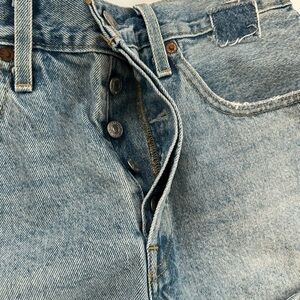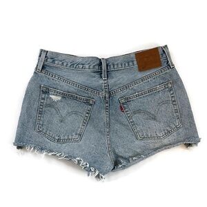 Stylish and comfortable, these Levi's blue denim shorts are perfect for casual outings. Distressed by design with a button fly.