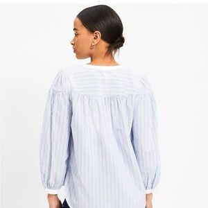This LOFT blouse features a relaxed, boxy fit with elegant puff sleeves and a mandarin collar, all in a chic blue and white color palette. The lightweight fabric and flutter sleeve design make it perfect for casual outings or semi-casual events. Enjoy the comfort and style of this versatile top, ideal for enhancing your everyday wardrobe.