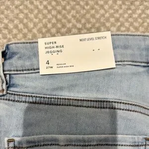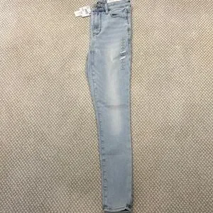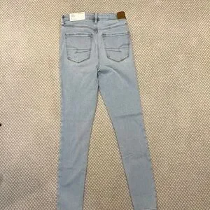 These high rise jeans from American Eagle Outfitters feature a classic blue denim with a stylish distressed finish. The tapered leg design offers a modern fit, making them a versatile addition to any wardrobe.