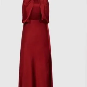 This stunning dark red dress features a halter neckline and a daring slit, perfect for a cocktail night out. Its sleeveless design and vibrant color make it a standout piece, while the cut-out details add a touch of sophistication. Slightly damaged see video. Negotiable.