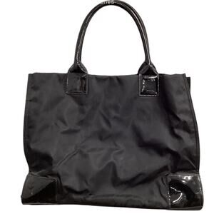 Tory Burch Ella Tote Bag Large Black Patent Leather Logo Nylon. Clean and in good condition. Slight white mark on the front of the logo as seen in pictures. Some scuffing on the inside of upper handles also pictured mild signs of war on the corners. 8/10 condition. Beautiful bag, clean on the inside. Large enough to fit a laptop.
