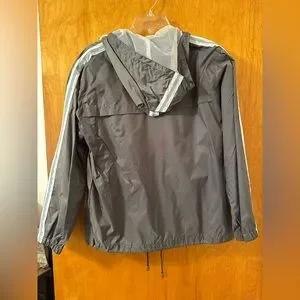Lightweight gray windbreaker. Features a hood and zip closure. Perfect for outdoor activities.