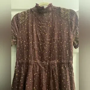 Features: Tiered pleated skirt, sheer top, ruffled trim, button-up front, tie waist