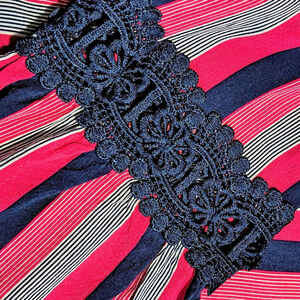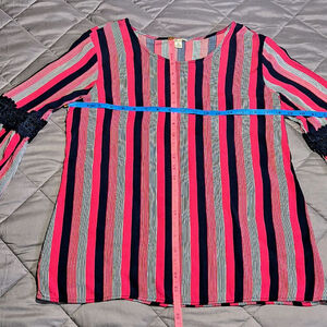 This Cato brand blouse features vertical stripes in pink, navy, and white. The blouse has long, bell sleeves trimmed with navy lace. Pre-owned. Size MEDIUM.