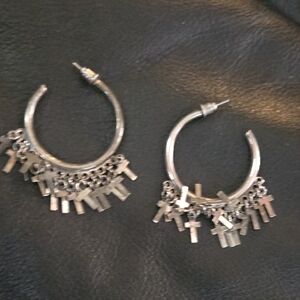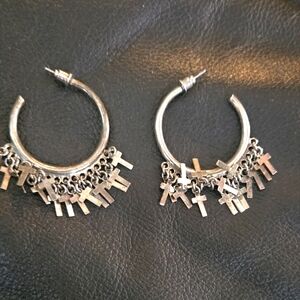 These are super cool silver hoop earrings featuring cross dangling elements by Dolls Kill. Perfect for adding a touch of sophistication to any outfit. These are approximately 2.5" in diameter. Please ask questions and make an offer. I can't say yes if you don't ask.