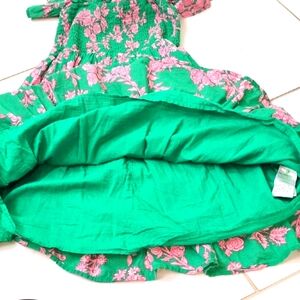 Charming kids dress featuring a vibrant green base with pink floral patterns. Perfect for any occasion.
