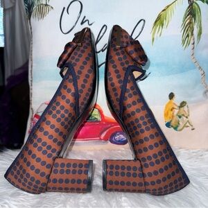 Tory Burch Bow Accent Polka Dot Chunky Heels In Brown & Navy Blue Size 7.5