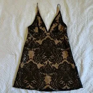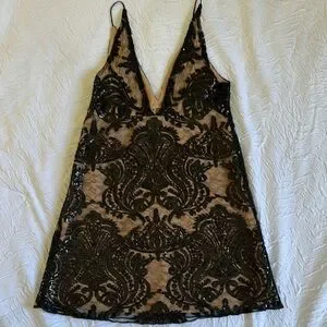Elegant mini dress with intricate black lace overlay. Features a deep V-neckline. Perfect for a night out.