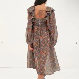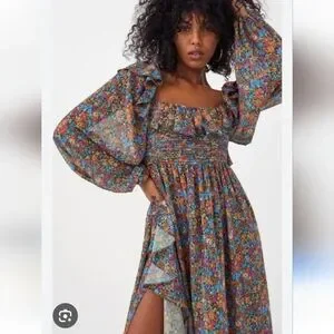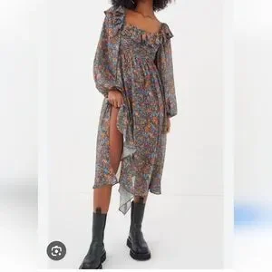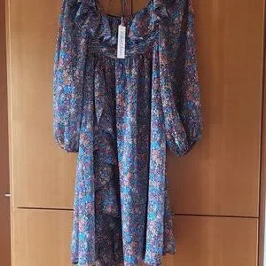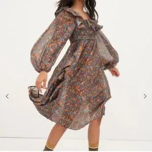 NWT. Dark ditsy print ruffled neckline. Horizontal pin-tucked bodice long billowy sleeves full skirt with cascading ruffle along side slit. Gorgeous.