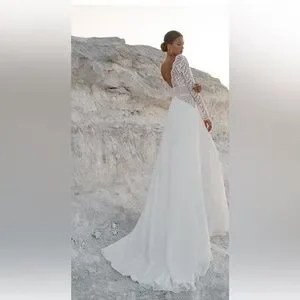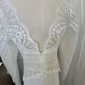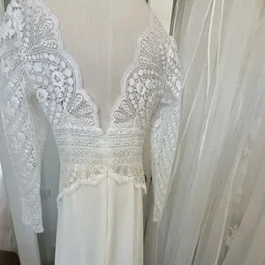 This elegant lace dress features a stunning ivory long sleeve size 14 perfect for any special occasion. The intricate lace detailing adds a touch of sophistication and style. Excellent condition. Tried on boutique setting.