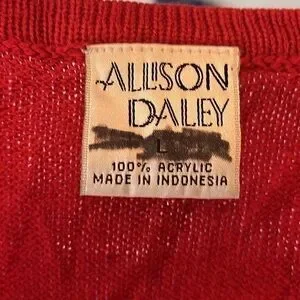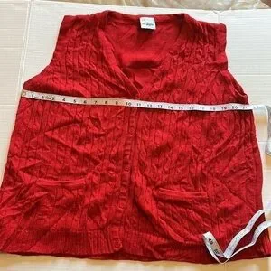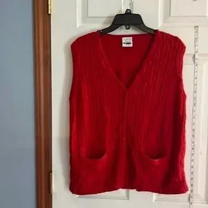VTG-Allison Daley-L-red sleeveless button down ,V-neck , cable knit design vest. Acrylic buttons down the front. Cable knit design on the front plain on the back. See photos for approximate flat measurements.