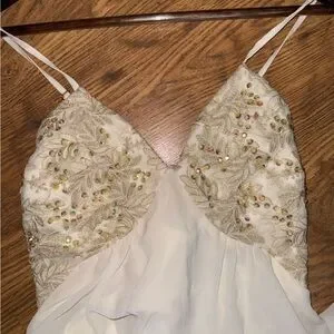 Maxi dress, This cream chemise features delicate lace and sequin detailing at the bust and a flowing A-line silhouette. Criss crossed Adjustable straps.