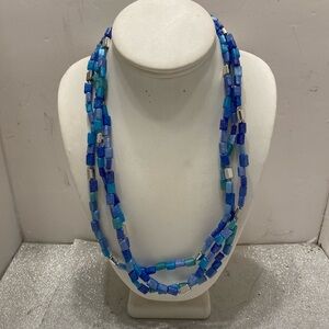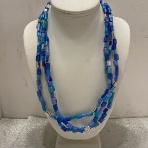 Elegant blue and silver beaded necklace perfect for any occasion. Add a touch of color and sophistication to your outfit.