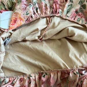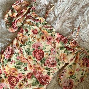 Charming floral off-shoulder dress with ruffle details. Features a mix of pink, yellow, and green hues.