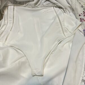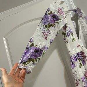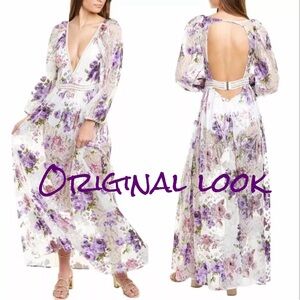 Elegant floral maxi dress with a deep V-neck and open back design by For Love and lemons. Perfect for any occasion. Size M. True to size 8. This dress is true to size. It is NO LONGER SEE THROUGH. Please check the size chart for this brand to make sure it fits. The top is very revealing I enclosed a pic. This is a final sale! If you have additional questions please message me and I will try my best to answer for you. The following ALTERATIONS were made: - changed the bell sleeves to normal regular fit. - added a slip. - added a tie back.