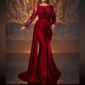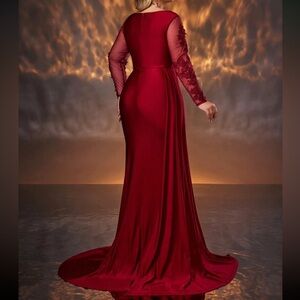 This stunning burgundy evening gown features intricate lace detailing and a flowing silhouette, perfect for any formal occasion. 88% polyester, 12% elastane