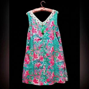 New with tags. Comes from a smoke-free, one-dog home size 2. With Ronnie, the shift silhouette transforms into a romper. Made from vibrantly printed satin back crepe, this breezy style features a V-neckline, side slits at the skirt, and lace trim. Has a zip back with tassel pull.
