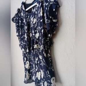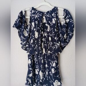 This elegant blouse by Polo Ralph Lauren features a striking blue and white color scheme with a delicate floral pattern. The flutter sleeves and ruffled cut-out design add a touch of femininity, making it a versatile choice for both casual and dressy occasions.