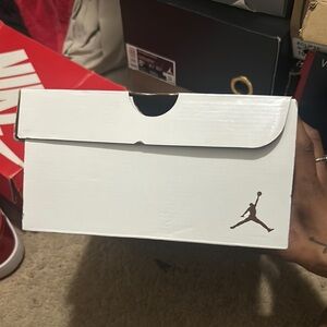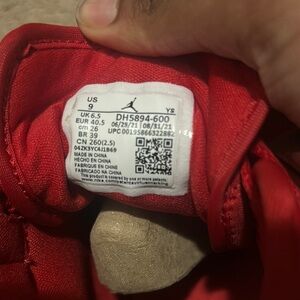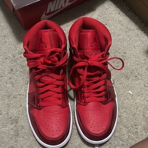 These Jordan sneakers feature a striking red patent leather finish that catches the light beautifully. The high-top design is paired with a contrasting white midsole, creating a bold and stylish look. Perfect for making a statement with your footwear.