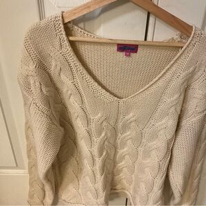 Stylish cream cable knit sweater. Perfect for a chic and cozy look. Sure to be a comfy go-to wardrobe piece in your wardrobe.