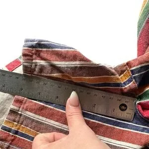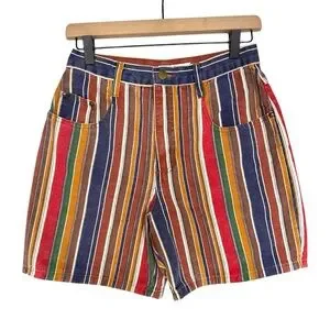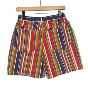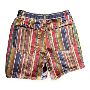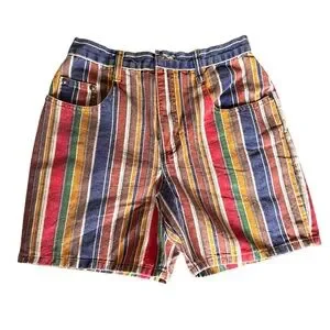 The product is a pair of colorful striped women's shorts by the brand Jay Jacobs in a size 11, reminiscent of the 90s Y2K era. These high-rise chino style shorts are made of denim and feature a multicolor striped pattern, perfect for adding a fun and vibrant touch to any outfit. Made in the United States, these shorts have a waist size of 29 inches and are designed for a regular fit, providing both comfort and style for any fashion-forward woman looking to make a statement with their clothing choices.