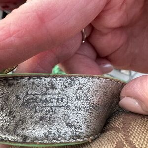 Wow! The stories these flip flops could tell! Stylish slide sandals with a green patent strap and suede floral accent. Brown patterned base with the iconic COACH brand. The inner strap color has worn away, but honestly, that’s really the only thing that gives the age away.