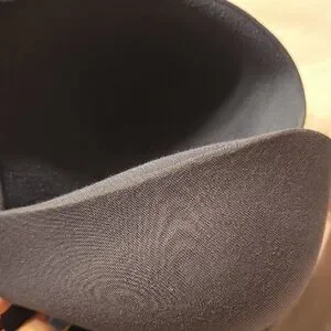 Experience comfort and support with this sleek black bra, perfect for everyday wear. straps have notable wear on the inside, nothing a razor cant fix. bra cup on right side has a misshape where is it curling forward. everything is pictured. hardwear is good 38D