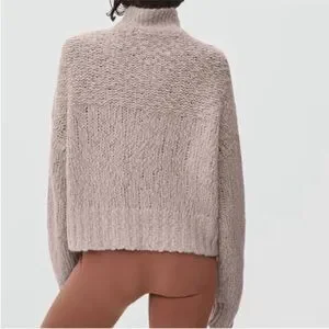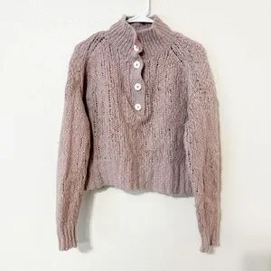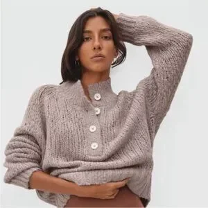 Beautiful cozy sweater from Everlane. This Lofty Knit Henley Alpaca Henley Sweater is a perfect charming pink color and features a mock neck.