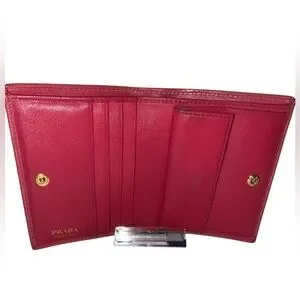 The wallet features a sleek bi-fold silhouette accented with a polished gold-tone Prada logo on the front. Inside, you’ll find a well-organized interior with multiple card slots, a bill compartment, and a secure snap-button coin pocket, making it both functional and fashion-forward.