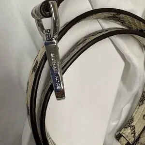 Stylish snake print strap by Michael Kors. Features a chic black and cream pattern. Michael Kors mark on silver hooks.